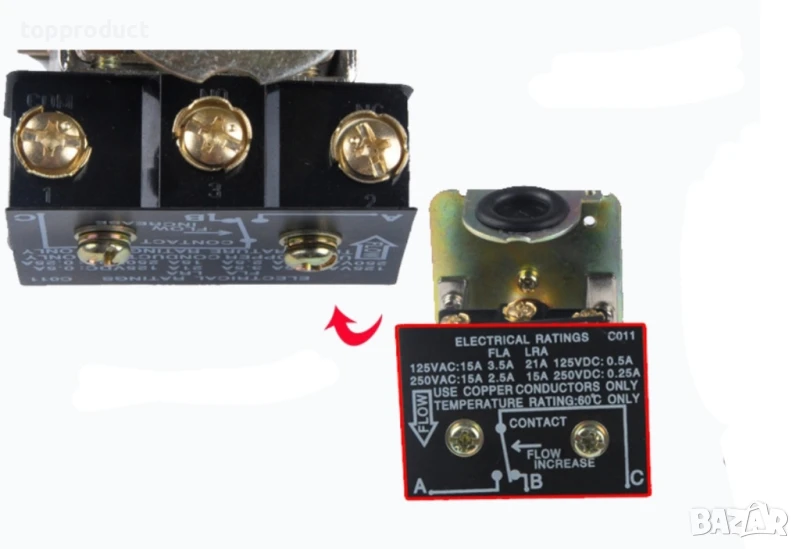- Параметри на микропревключвателя: 15A (макс.), 250VAC/DC)
