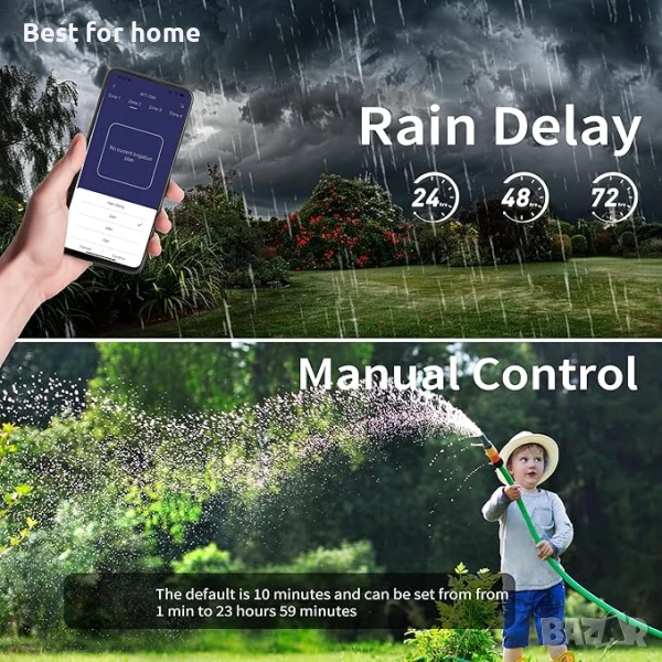 Забавяне при дъжд и ръчно поливане: Трябва ли да направите пауза от редовния си график за поливане? WiFi таймерът за поливане Diivoo разполага с функция за забавяне при дъжд, която ви позволява да зададете 24, 48 или 72-часово прекъсване на поливането в дъждовен ден, за да пестите вода. Ако трябва да поливате незабавно, можете да превключите на ръчен режим чрез клапана или чрез приложението, за да използвате крана, когато имате нужда.