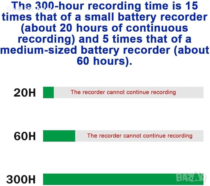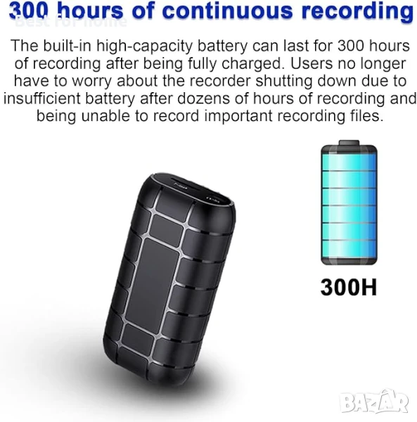 【Дълго време на работа на батерията】Диктофонът има вградена батерия с голям капацитет, която може да записва непрекъснато в продължение на 300 часа след пълно зареждане.