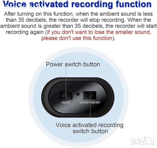 Моля, обърнете внимание: След включване на тази функция, когато околният звук е по-малък от 35 децибела, рекордерът ще спре да записва. Когато околният звук е по-висок от 35 децибела, рекордерът ще започне да записва отново (ако не искате да загубите по-слабия звук, моля, не използвайте тази функция).Изключено), рекордерът може да бъде изключен и файлът да бъде запазен.