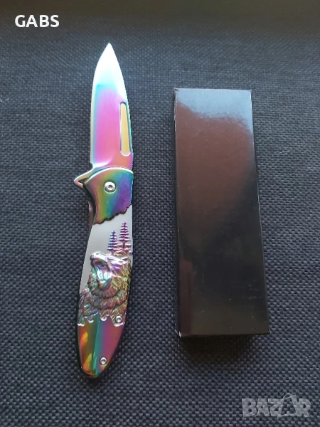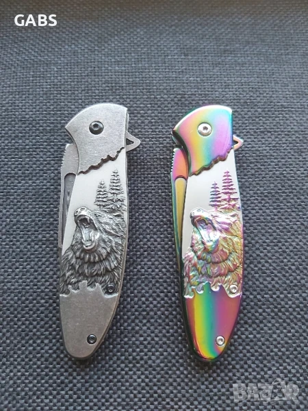 Сгъваем джобен нож с гравирана ръкохватка с мечка и острие от неръждаема стомана.Ножът има красиво гравирана дръжка и щипка за носене на колан или джоб.Предлага се в два цвята- хамелеон и черен.