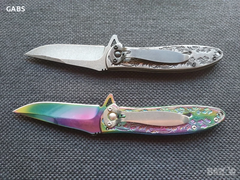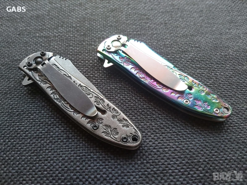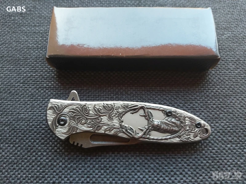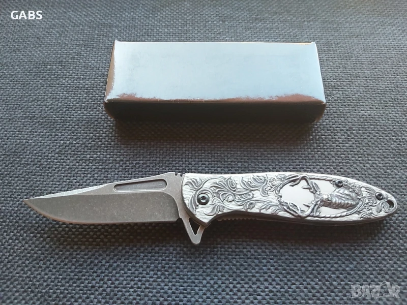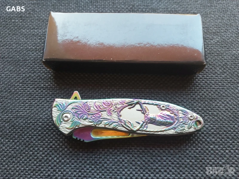 Сгъваем джобен нож с гравирана ръкохватка с елен и острие от неръждаема стомана.Ножът има красиво гравирана дръжка и щипка за прикрепяне към колан или джоб .Предлага се в два цвята- хамелеон и черен.