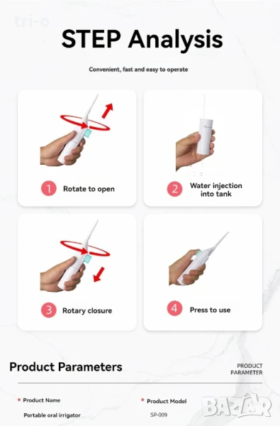 • Лесен за употреба: С удобния си дизайн, този орален иригатор е лесен за употреба, което прави грижата за зъбите изключително лесна.