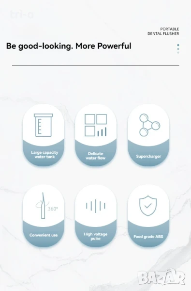 • Иригатор за устна кухина с високо налягане: Този преносим дентален инструмент ефективно почиства зъбите ви, достигайки до зони, до които миенето с четка не може, предотвратявайки кариеси и заболявания на венците.