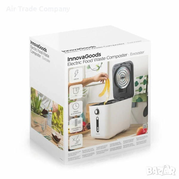 Този електрически кухненски компостер с обем 3 литра и мощност 550 вата превръща кухненските отпадъци в компост по лесен, безшумен и безмирисен начин за период от 6 до 10 часа. Уредът е оборудван с тройно острие, керамично покритие и подвижна кофа, както и с три въглеродни филтъра за неутрализиране на миризми.