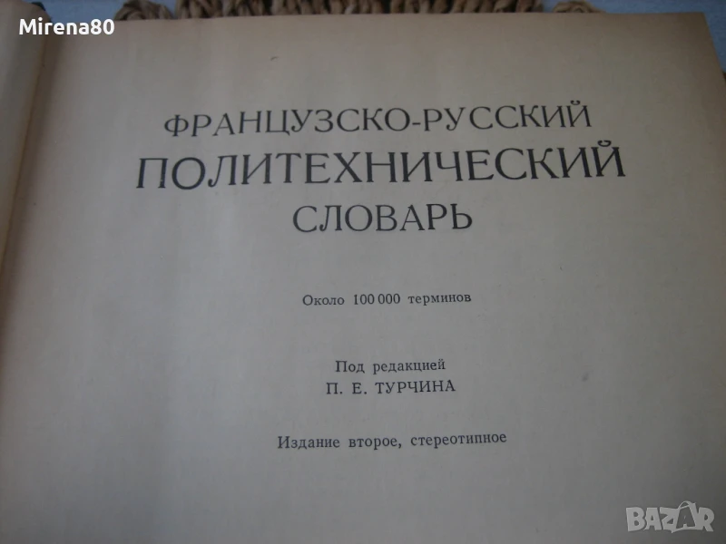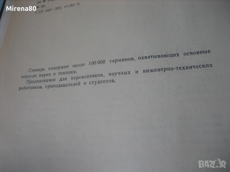 Хубав и ценен речник ! Изд. Москва, 1970 г Голям формат, твърди кожени корици със златни букви, 836 стр. Съдържа около 100 000 термина от всички области на науката и техниката. Отлично състояние !