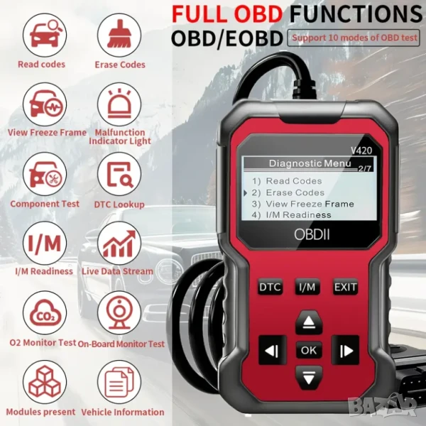Full OBD2 EOBD автомобилен диагностичен кодочетец V420, наличен в син, оранжев и червен цвят, вижте снимките към обявата. Освен друго, снимките към обявата са красноречиви за възможностите на уреда.