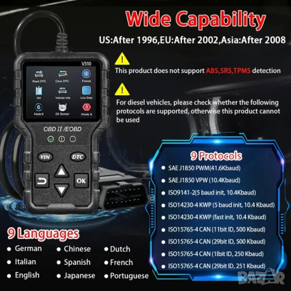 Последна версия на OBD2 диагностичния скенер V310 за 2025 г. предлага пълни функции на OBDII, режими 6/8, четене на кодове на двигателя, актуални данни, тестване на напрежението на батерията и възможности за ресет, съвместим с всички OBDII/EOBD превозни средства, произведени след 1996 г.