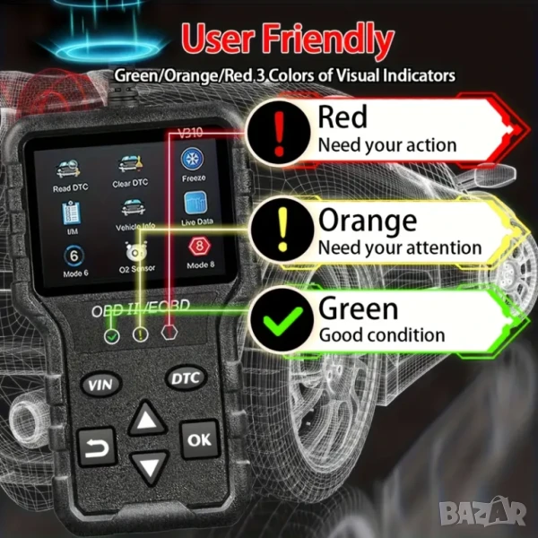 Full OBD2 EOBD автомобилен диагностичен кодочетец V310, наличен в черен и червен цвят, вижте снимките към обявата. Освен друго, снимките към обявата са красноречиви за възможностите на уреда.