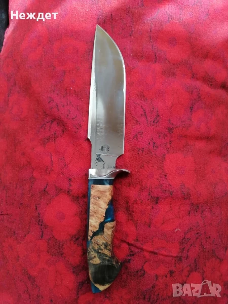 Нож от кована танкова шпилка. Размери на острието 170/40/4,5мм.Дръжката от неръждаем гард и хибрид от стабилизирана елша. Ножа е без кания, но може да се направи по желание на клиента.
