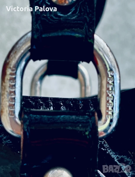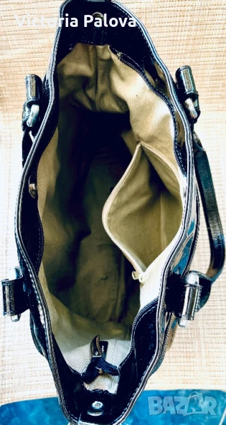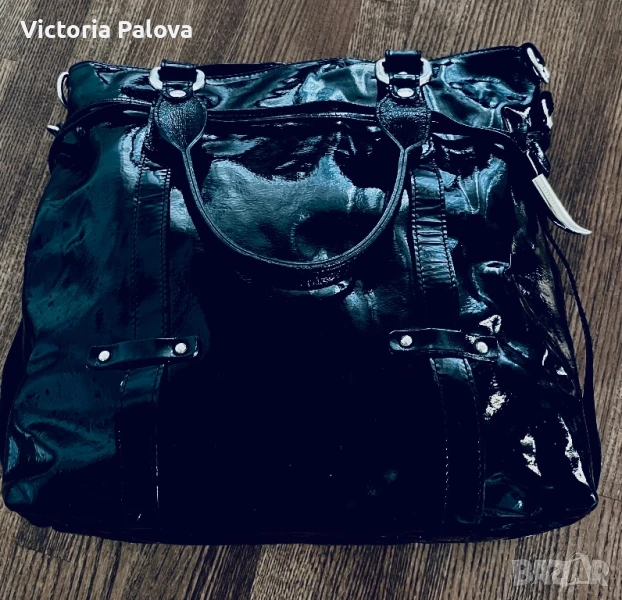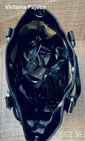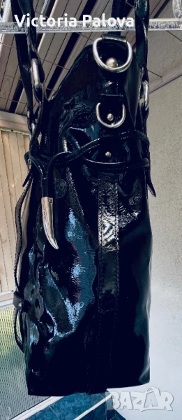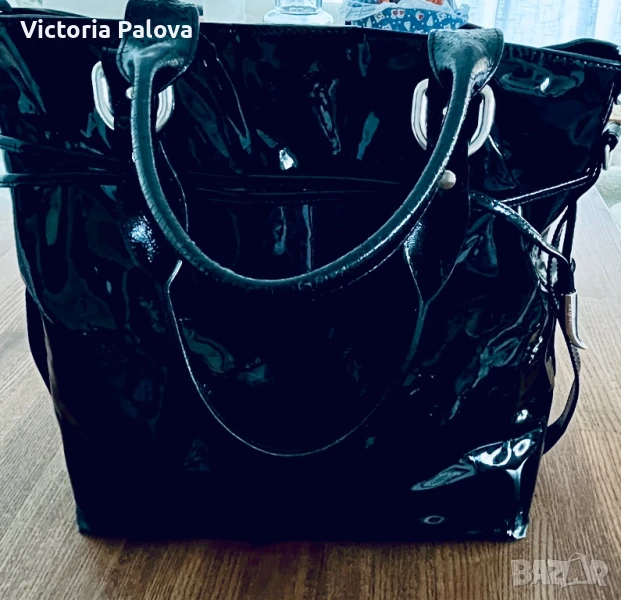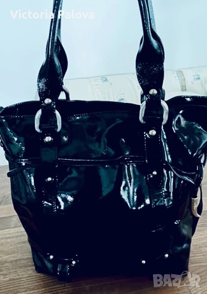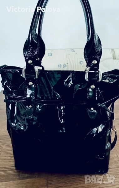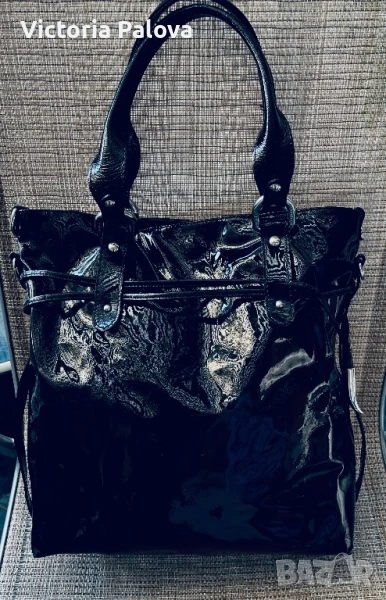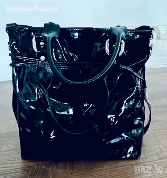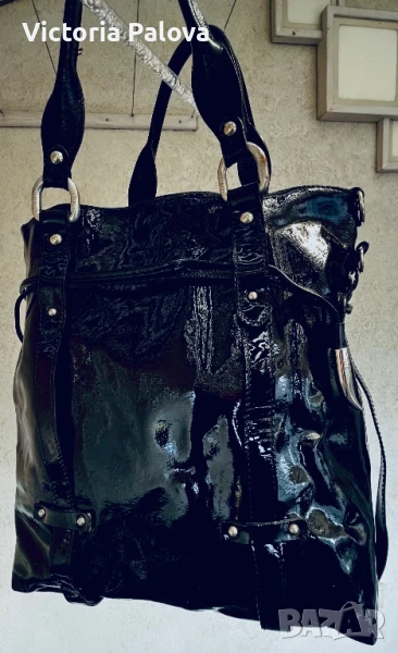 Красива лачена чанта естествена кожа, удобна и вместителна, височина - 34см, широка - 34см. Дъното е 34см на 14см, твърди дръжки 42см, вътре е джоб с цип, на всички метални елементи има маркировка- логото на марката, чантата се затваря с цип и магнитно копче.