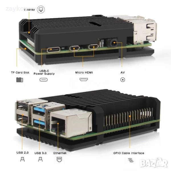Това е корпус от бронирана алуминиева сплав (корпус с радиатор за Raspberry Pi 4), предназначен за компютъра Raspberry Pi 4 модел b.