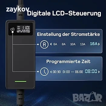 Регулируема настройка на тока и времето: лесно настройте зарядния кабел CEE 16A към тип 2 между 6 и 16 A, включително функция за забавяне. Моля, обърнете внимание: функцията за забавяне ви позволява само да зададете обратно броене, след което започва процесът на зареждане - не може да се зададе точно време за начало. Предоставя персонализирани услуги за зареждане и събира информация за употребата, за да защити по-добре акумулатора на вашето превозно средство.