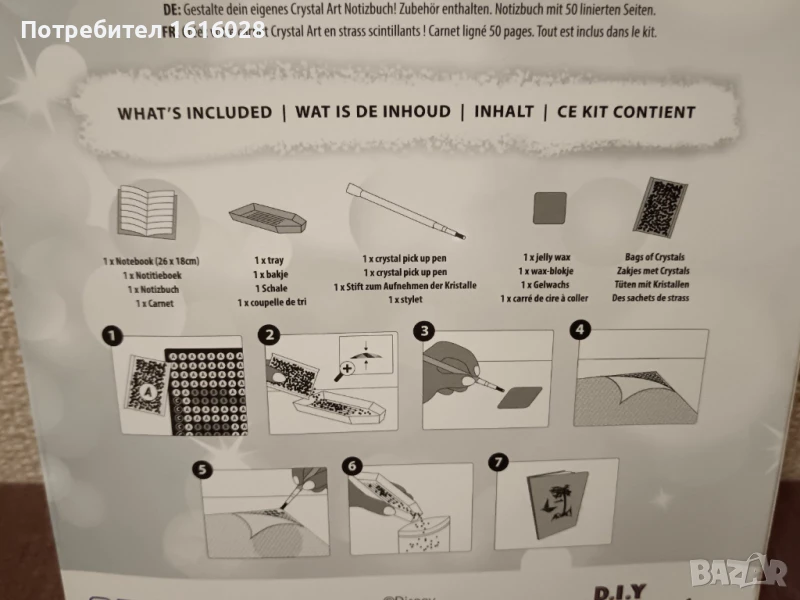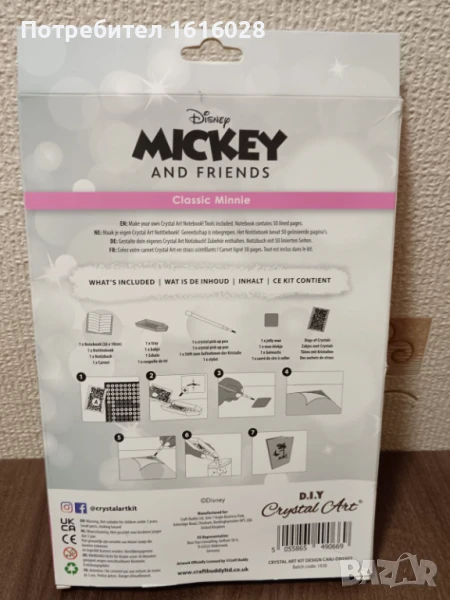 Комплекта се състои от тефтер с разделител,на който на корицата е изобразена Мини Маус и трябва да се облепи с диамантени камъчета в различни цветове,форми и размери.Има 1 писалка,1 восък,1 контейнер,и пакетчета с камъчета.