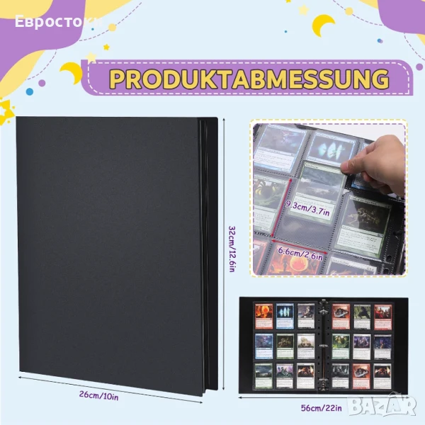 Албумът за колекционерски карти Lictin съдържа 30 страници, всяка страница има 18 слота за карти, общо 540 слота за карти 6,6 см х 9,3 см. Ръкави за карти: има и достатъчно място за съхранение на любимите ви карти.