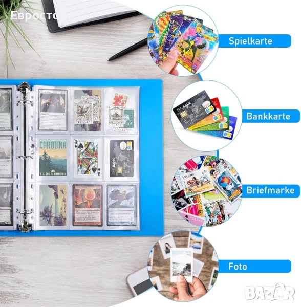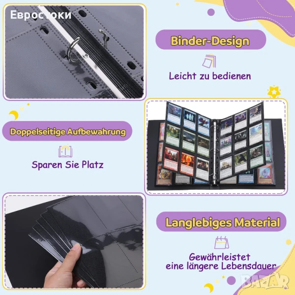 Можете да използвате калъфите за карти, за да ги организирате лесно. Пръстените на албума за класьори могат да се отварят по желание и можете да добавяте допълнителни страници с прозрачни калъфи, за да съхранявате повече карти.