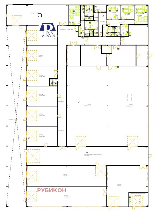 Сграда с площ 2567 кв.м, разположена в УПИ с площ 7948кв.м. 19 броя складови и работни помещения, административна част, санитарно-битова част, прилежащи площи 3500кв.м шлайфани бетонови настилки с дебелина 20см, масивни огради на парцела.
