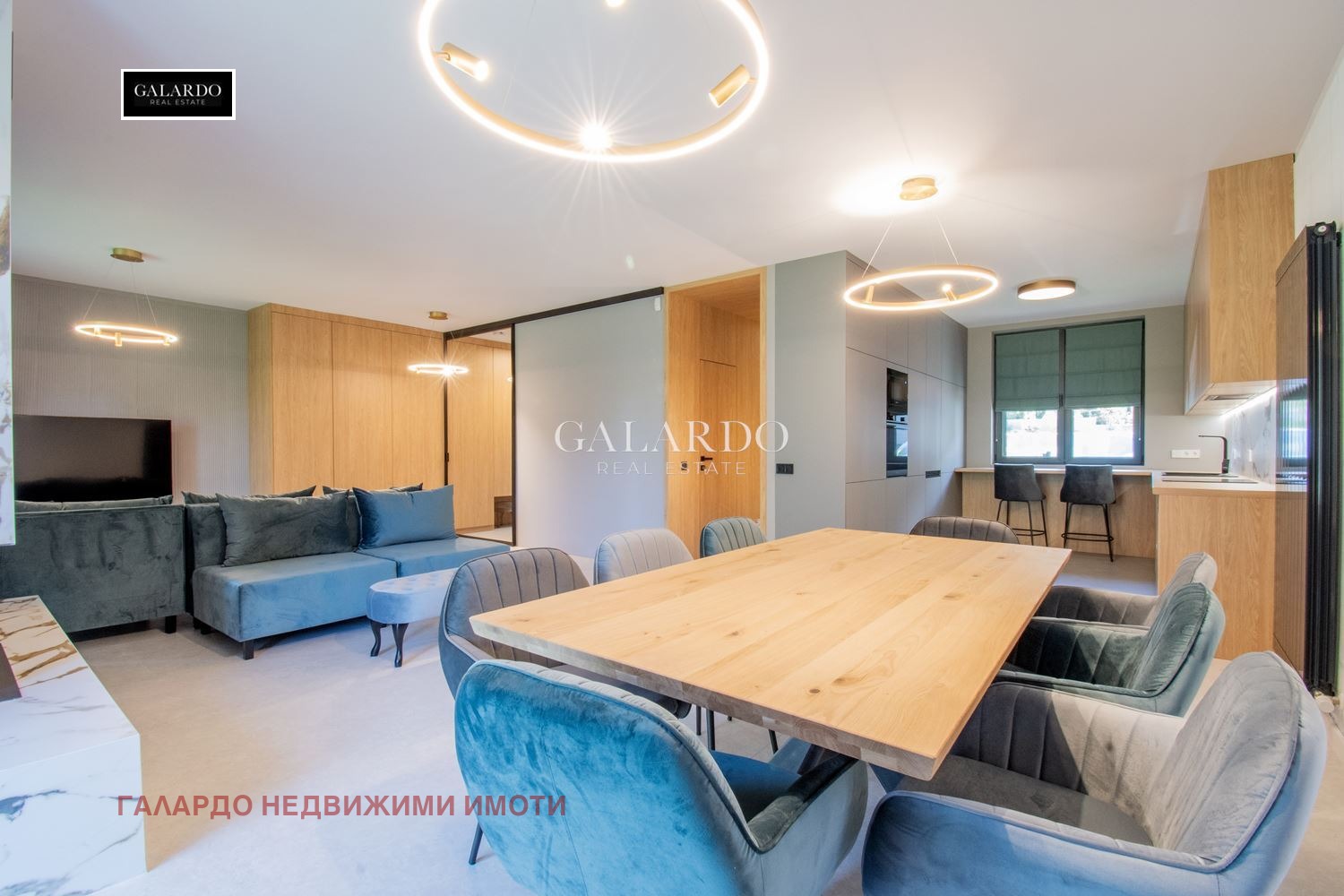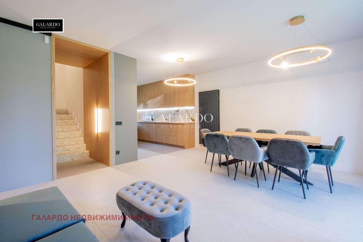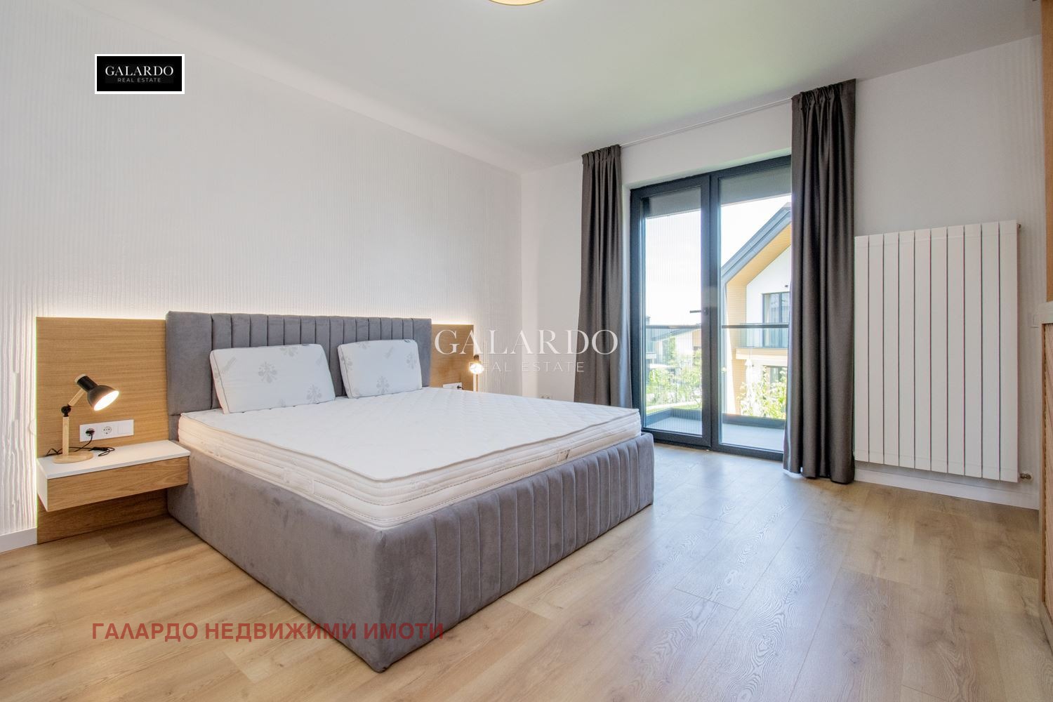 Galardo Real estate има удоволствието да представи чисто нова луксозна къща с 3 спални и мансарден етаж под наем със собствен двор в един от предпочитаните затворени комплекси в Симеоново. Лайтмотивът на комплекса е живот сред природата и той се изразява в създаване на безценни моменти в уютна и хармонична жизнена среда близо до града и в подножието на планината. Комплексът осигурява спокойствие чрез денонощна охрана, поддръжка на общите площи и допълнителни общи паркинги. Тази елегантна двуетажна къща разполага с три спални, едната от които мастър бедрум със собствена баня, осигуряваща максимален комфорт и уединение. Просторният и стилно обзаведен интериор, съчетава модерен дизайн и функционалност. Къщата разполага с две паркоместа пред входа.