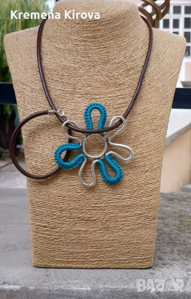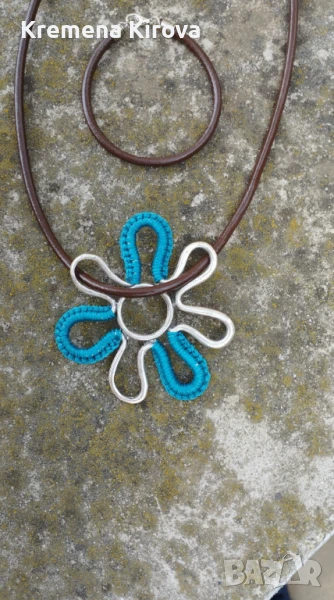 Колие и гривна с масивно цвете и естествена кожа. С плетка. → Обява 50681165
