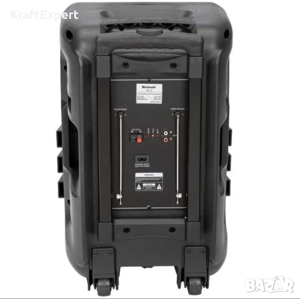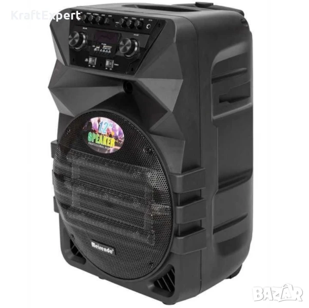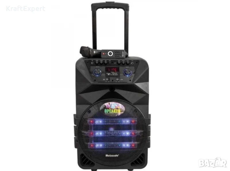 Нов модел тонколона Meirende К5-12 за караоке с Дисплей, FM тунер, Дистанционно, Bluetooth функция, безжични микрофони 2 бр. и вече с още по-голям и по-мощен 12 инчов басов говорител. Идеална за улични музиканти, купони, презентации, караокета в хотели, ресторанти и др. Колоната е много удобна и за ползване на места където няма електричество, тъй като е с вграден мощен акумулатор.Технически характеристики:⇒ Мощен 12 инчов басов говорител⇒ Колона с акумулаторна батерия (зарежда се от 220V или от 12V)⇒ Размери: ширина: 58см, Дължина: 49см, Височина: 90см⇒ Bluetooth функция - сдвоявате колоната с вашият GSM, компютър или лаптоп и слушате любимата си музика напълно безжично - обхват до 25 метра⇒ FM тунер⇒ Дистанционно управление⇒ Дисплей⇒ Възможност за самостоятелно използване без връзка с компютър чрез SD/MMC/MMS карта или USB Flash устройство⇒ Вход от външно устройство (компютър, GSM, Ipod, PSP & MP3/4 Player)⇒ Светлинна индикация при зареждане на батерията и при вече заредена батерия⇒ Караоке система с регулиране силата на микрофона⇒ Вход за 2 бр. микрофони (ефект "Ехо" и регулиране на силата на звука)⇒ Безжични микрофони - 2 бр. включени в комплекта (220-270MHz)⇒ Вход за китара⇒ Регулиране нивото на звука на китарата⇒ Удобна разтегателна дръжка за лесно пренасяне⇒ Колелца за лесно пренасяне⇒ Мощност: 300W
