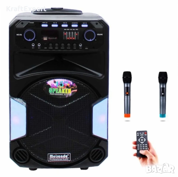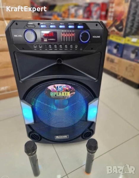 караоке тонколона с множество функционалности.Интегрира се с разнообразни мобилни и безжични устройства, музикални инструменти и друга аудио техника.Тонколоната е особено подходяща за различни публични изяви на музиканти, артисти, презентатори. Също така е приложима за конференции, спортни и други дейности в зали, детски празненства, училищни мероприятия на открито или закрито, караоке, купони, сватбени и други тържества. Колоната е много удобна и за ползване на места, където няма електричество, тъй като е с вграден акумулатор. Разполага с разтегателна дръжка и колелца и е много комфортна за придвижване и преместване.Комплекта включва:1бр. 15инча караоке тонколона2бр. безжични микрофони1бр. кабел за системата – 220V1бр. дистанционно управление.