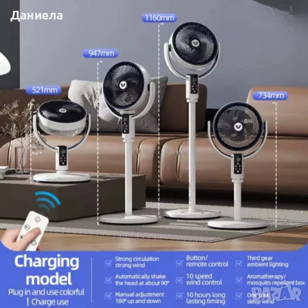 📌 Основни характеристики• Цялостна 360° осцилaция — върти се хоризонтално и вертикално, което осигурява равномерно разпределение на въздуха в помещението  .• Регулируема височина — от ~53 см (21″) до ~91 см (36″), подходящ за поставяне на под или бюро .• DC мотор — тих и икономичен, предлага няколко режима (например нормален, тих, спящ) .• Дистанционно управление и бутони на основата — удобно регулиране, особено нощем .• Таймер — позволява да зададете време за автоматично изключване .⸻✅ Предимства според потребители и рецензии• Тих и мощен — отзиви сочат “quiet and pushes a lot of air”, идеален за включване по време на сън или отпочивка .• Висока ефективност — описан като продукт, който заменя няколко по-малки вентилатора “does the job of three fans” .• Лесна настройка и управление — дистанционното и интерфейсът на корпуса се използват интуитивно .• Универсално приложение — подходящ за спални, хол, офиси и кухни за пълна циркулация на въздуха.ПараметърСтойностВисочина21″–36″ (53–91 см)Диаметър:около 32 см (12.6″)Мощност72 WВъздушна скорост1.7–6.9 m/sНиво на шуматих режим, но специфични dB не са предоставениМатериалиABS + полипропиленТегло~2 kg (5.45 фунта)Захранване120–127 V, 0.6 A