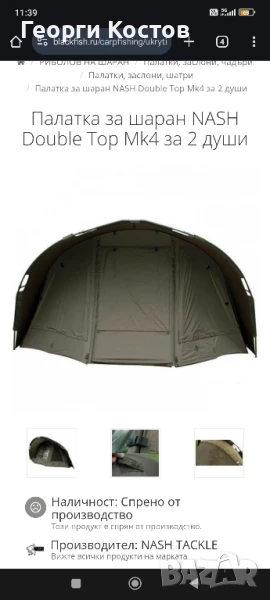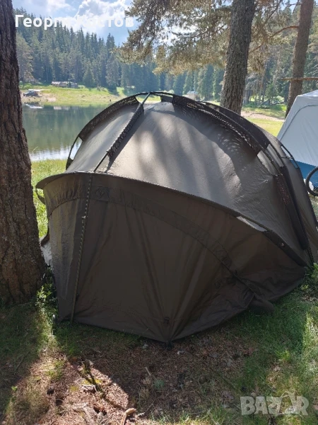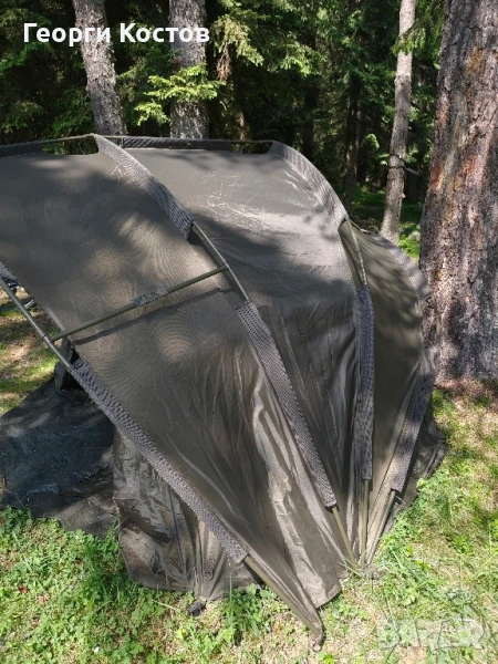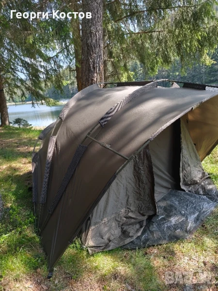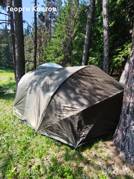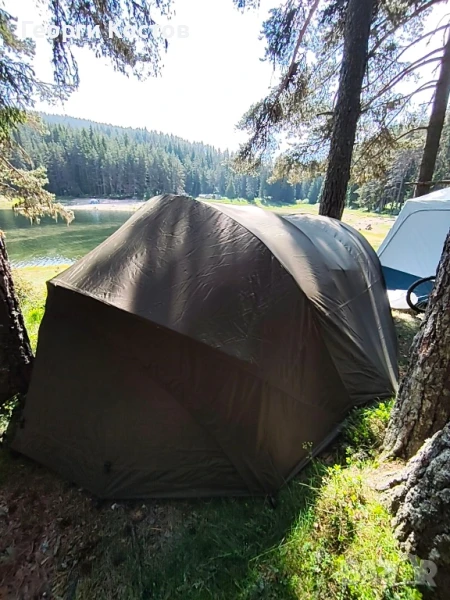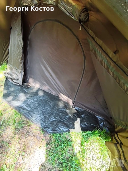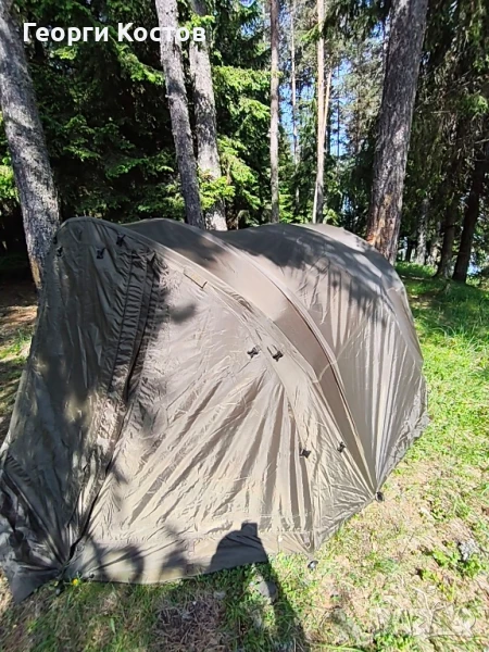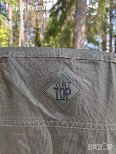 Здравейте палатката е в перфектно състояние основната част е за двама души със капсула. Има си и зимно покривало което я прави много голяма като предверие или за + 3-ма човека още. Два сака единия си е за палатката другия е за зимното покривало и два комплекта колчета. Пловдив и София лично предаване.NASH Double Top Mk4 2 Man е класическа шаранска палатка с рамка за двама души. Палатката е двуслойна, поради наличието на вътрешна подвижна капсула.Най-продаваната в света палатка NASH Double Top току-що стана още по-добра. Вътрешната тръба и сглобяването в една стъпка я правят невероятно удобна навсякъде!Класическата концепция за вътрешната капсула на палатката с най-новите фитинги и довършителни работи е готова да осигури изключителен комфорт. Благодарение на надеждността, висококачественото изпълнение и подвижната капсула, можем уверено да наречем NASH Double Top Mk4 една от най-добрите палатки в света.Предлага се в едноместна, двуместна и Giant High версия за максимален комфорт и възможност за ходене без навеждане за по-дълги сесии, NASH Double Top Mk 4 е лидер на пазара в Европа.ОСНОВНИ ХАРАКТЕРИСТИКИ:- Включена е вътрешна подвижна капсула, пашкул ;- Модулен дизайн, създаден с помощта на система за компютърно проектиране- Твърда рамка с четири стълба за повишена стабилност при силни ветрове- Широк вентилационен панел с мрежа против комари- Бърз монтаж, двоен тента, вътрешна защитна мрежа, предотвратяваща влизането на малки животни и насекоми- Прозорци с мрежа против комари на ципове и велкро- Врата с прозрачен PVC панел, която може да се отвори наполовина- Здрава изтривалка за врата- Предлага се с опъващи стълбове- Велкро ленти за фиксиране на стълбовете- Включени са чанта за носене и Т-образни колчетаРазмери: 278 см (ш) x 250 см (д) x 165 см (в).Тегло: 18,6 кг