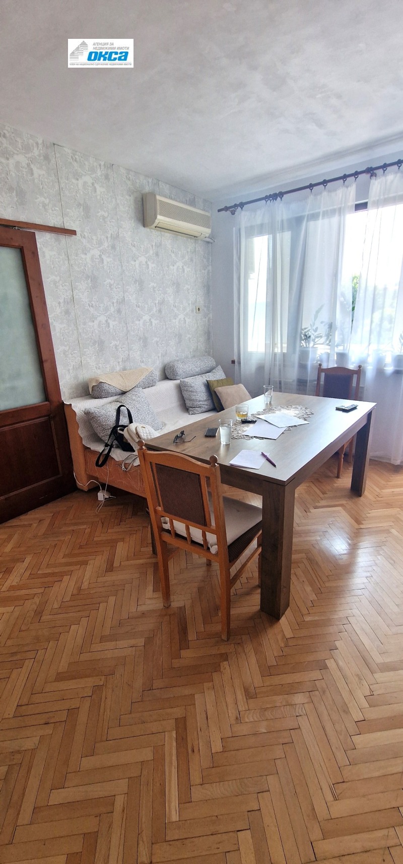Оферта 2039 - Агенция за недвижими имоти ' ОКСА ' предлага тристаен , обзаведен апартамент в идеалния център , в близост до пощата, полицията, съда. жилището е 87 м2 с маза от 14 м2 и таван от 10 м2. Състои се от две спални, хол, кухня, баня, тоалетна, голяма тераса. С PVC и ал. дограма, настилки паркет и теракот. Продава се напълно обзаведено с нови ел. уреди , нови мебели , климатик и два бойлера. Апартаментът е с ТЕЦ и топла вода.