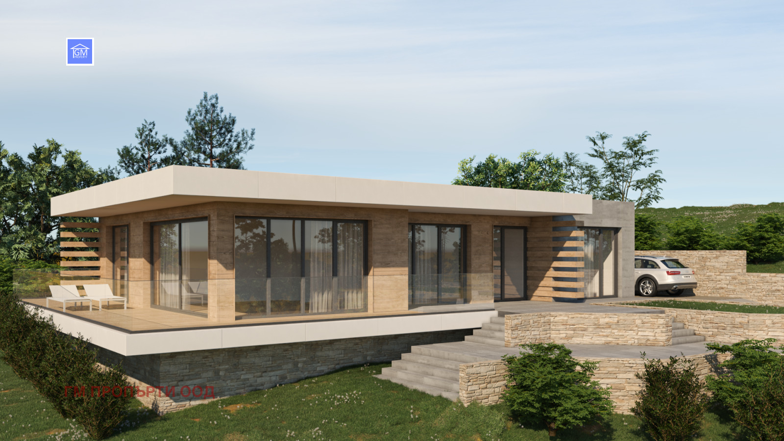 Къщата е в модерен стил с ниско строителство, което максимално се вписва в хармонията на заобикалящата я среда. Разположена на един етаж със следното разпределение: