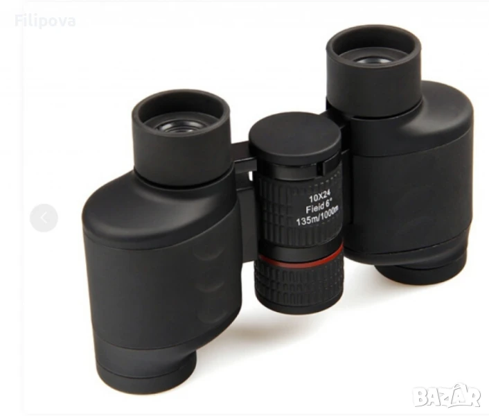 Тип продукт: Бинокъл;Компактният бинокъл 10x24 е идеалният избор за всеки, който търси мощен и лесен за пренасяне уред за наблюдение. Независимо дали става дума за разходка в планината, спортно събитие, къмпинг или пътуване, този бинокъл съчетава удобство, лекота и добра оптична мощност.Увеличение: 10 пъти;Диаметър на обектива: 24 мм;Зрително поле: 135 метра на 1000 метра;Зрителен ъгъл: 6 градуса;Централен фокусен механизъм;Материал на корпуса: Гума и пластмаса;Лещи с покритие против отблясъци.1г гаранция