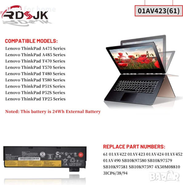 Забележка: Тази батерия е външна батерия с капацитет 24Wh, тези лаптопи имат и вътрешна батерия.