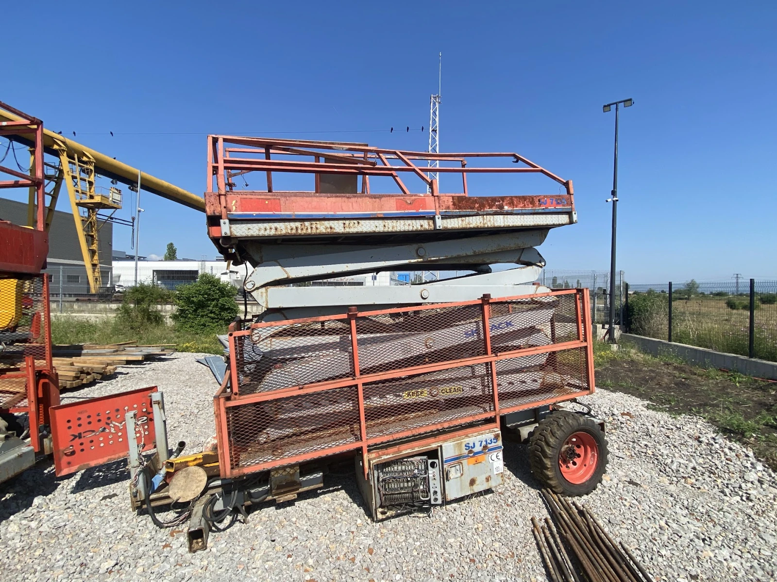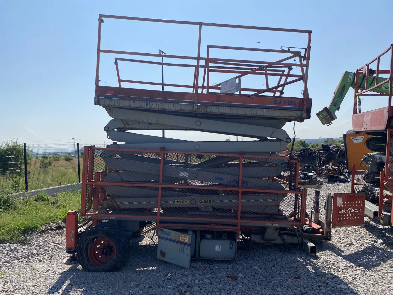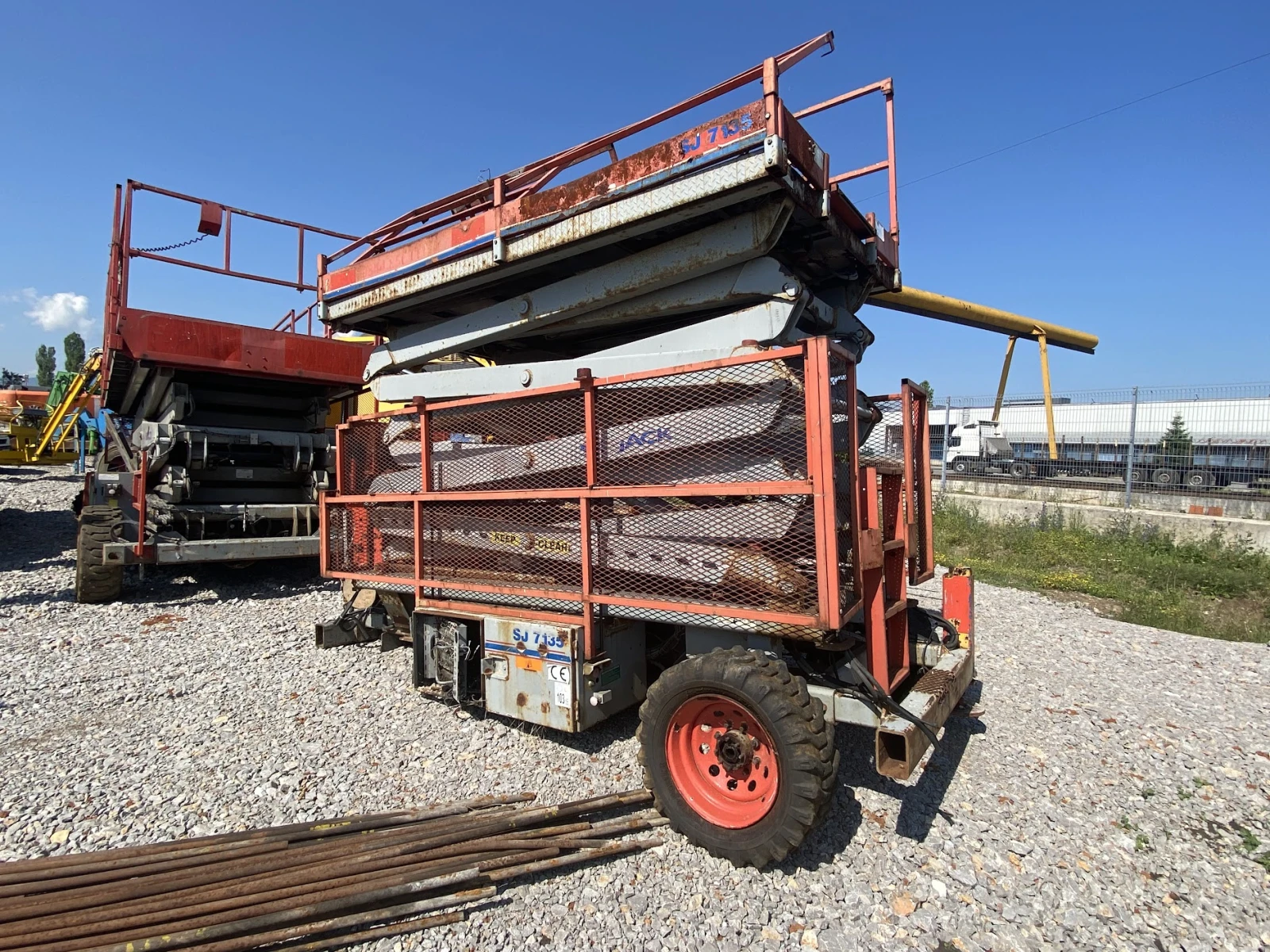 вишка SkyJack SJ7135 RT (2003) за части Кат. ном. BTX15138 Марка: SkyJack Модел: SJ7135 RT Година на производство: 2003 Тип: Rough Terrain ножична вишка за части Състояние: За части (неоперативна) Основна информация Работно тегло: 4014 kg Макс. товароносимост платформа: 454 kg Макс. броя хора: 4 Работна височина: 12. 50 m (41′ ) Височина на платформата: 10. 67 m (35′ ) Надстройка платформа: 1. 40 m разширение (roll-out deck) Капак с перила: Да Ръчни стабилизатори: По избор Размери (градско/транспортно) Транспортна дължина: 3300 mm Транспортна ширина: 1800 mm Транспортна височина (с перила): 2700 mm Транспортна височина (перила свалени): 2130 mm Междуосие: 2410 mm Клиренс: 220 mm Радиус на завой (вътрешен): 2770 mm Радиус на завой (външен): 5260 mm Задвижване и двигател Задвижване: 4x4 груби терени (Detroit Locker rear, limited-slip front) Макс. наклон: 30 % Гуми: 10 x 16. 5 air-filled Двигател: Kubota dual-fuel / дизелов 31 к. с. Макс. скорост (събрана): 4. 8 km/h Макс. скорост (вдигната): 0. 6 km/h Функционалности и сигурност Контрол от платформата и базата Наклон аларма + прекъсване засъс движение Аларма при движение Сирена и мигалка 110 V AC GFI щепсел Система с телематика Работни светлини и огледала Дискови спирачки (задни) Тайминги и опции Повдигане с товар: 41 s Спускане: 44 s Вместимост: 454 kg стандартно (общо) Платформа: 1600 × 3000 mm (вътрешен размер) Надстройка (roll-out): 1. 37 m Опции (по избор): генератор 3. 5 kW, foam-filled гуми, независими стабилизатори