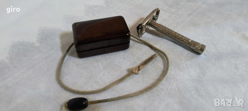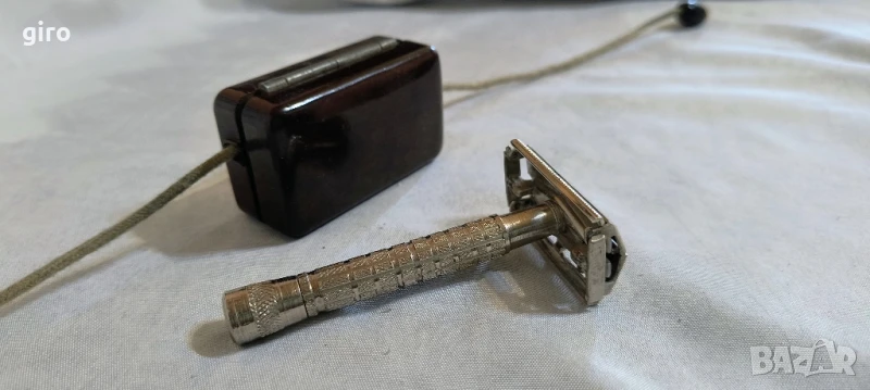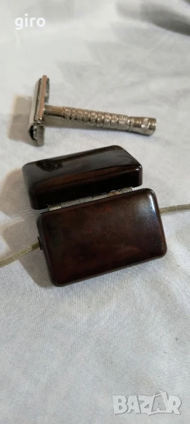 Стар антикварен уред за подостряне на бръснарски ножчета,работещ перфектно без забележки. Подарък към него самобръсначка с ножче,така се получава пълен комплект.