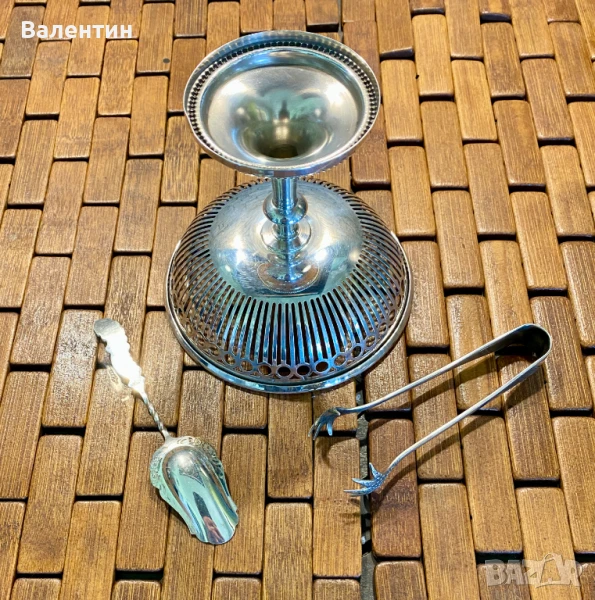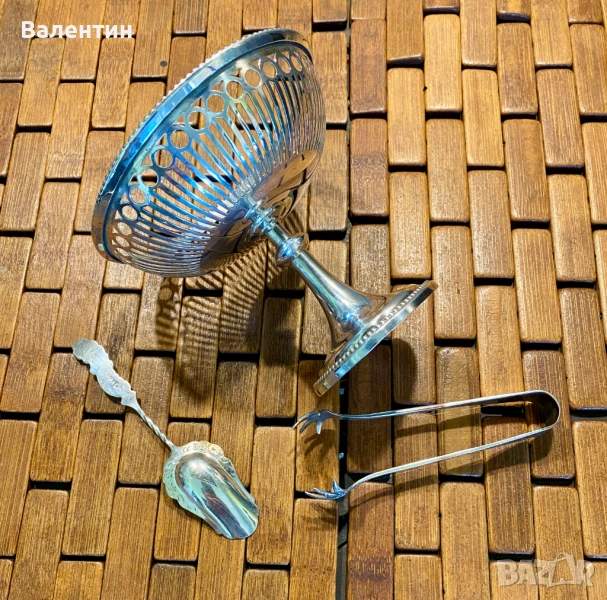 #2504# Комплект: купа за бонбони + лъжица + щипки. Винтидж. Посребрен. Маркиран. От Холандия. → Обява 50685284