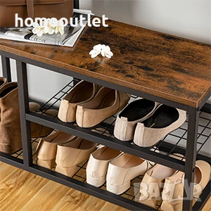 Рустикалните ретро ПДЧ панели и черната метална рамка изграждат семплата конструкция на тази многофункционална пейка с място за съхранение на обувки и закачалка, за да отговори на функциите за съхранение, спестявайки място.