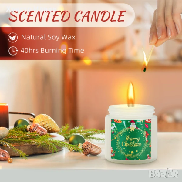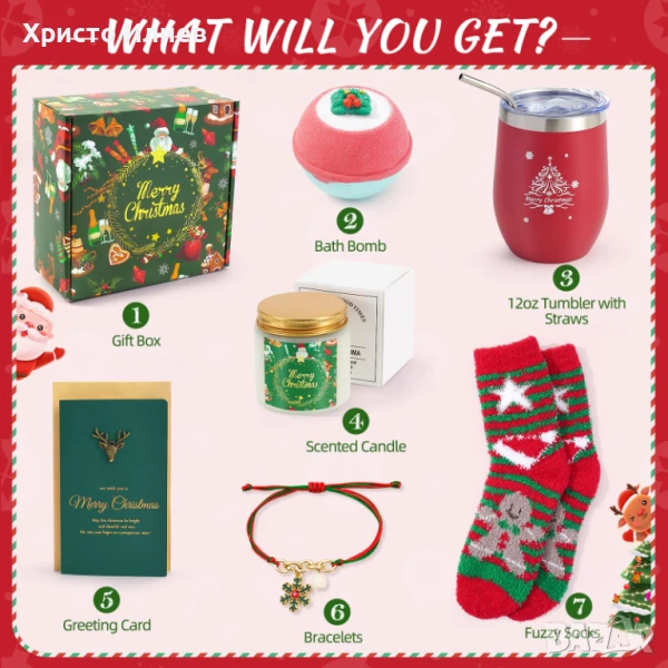 Коледен подаръчен комплект Термо чаша Гривна Коледни чорапи Свещ Бомбичка за баня Кутия Картичка