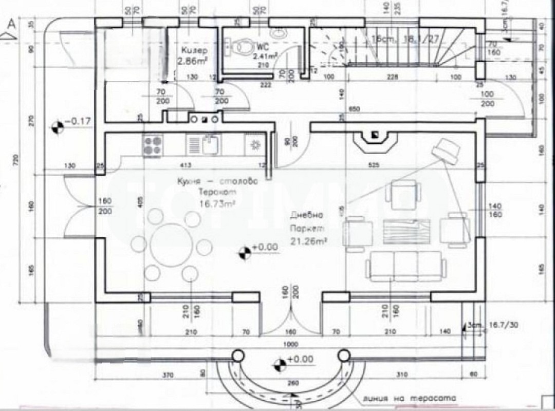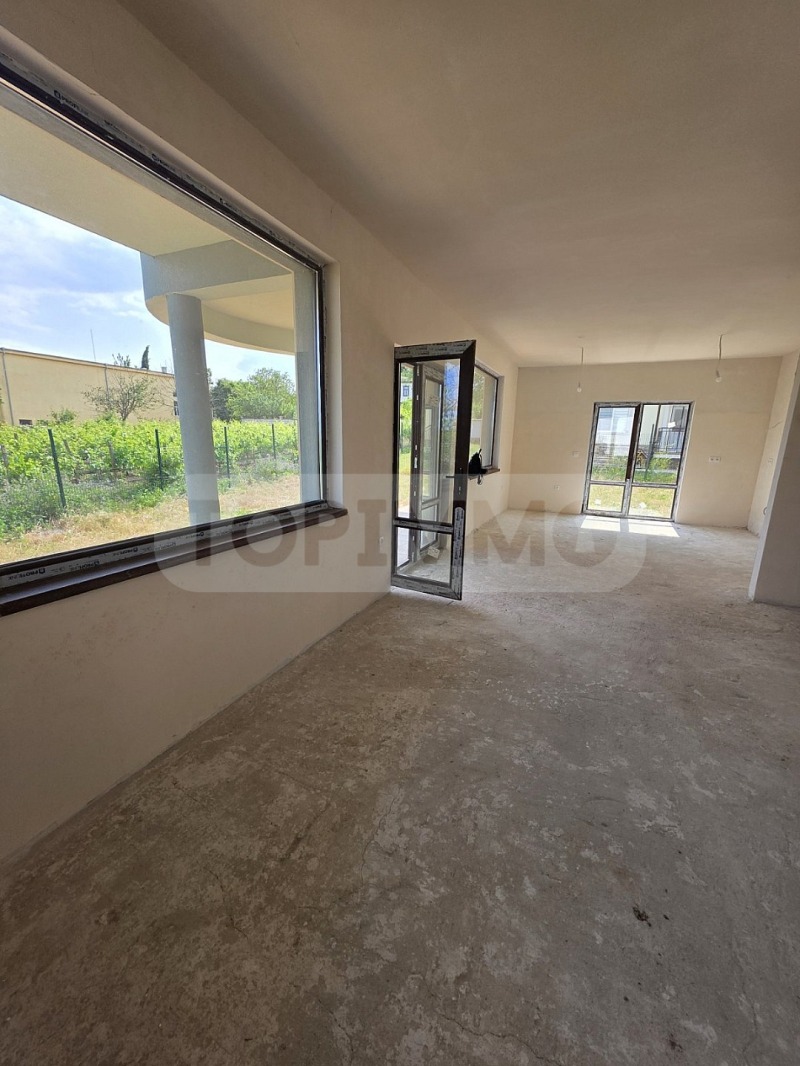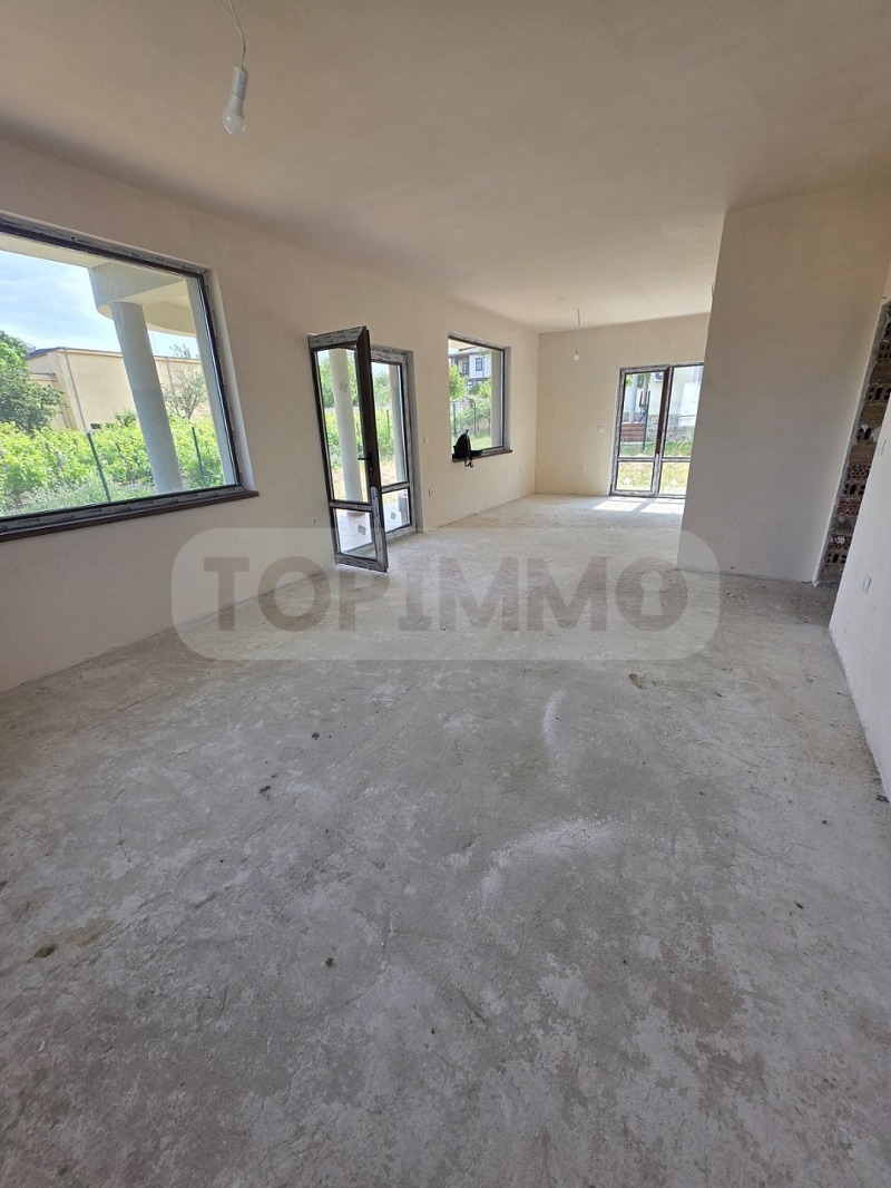 Първи етаж: голяма дневна с кухненска част, перално помещение, тоалетна и веранда.