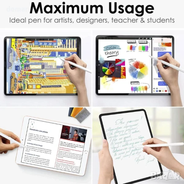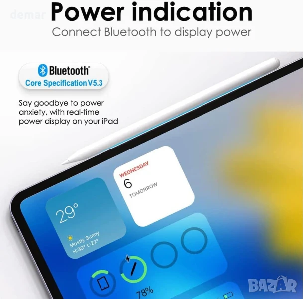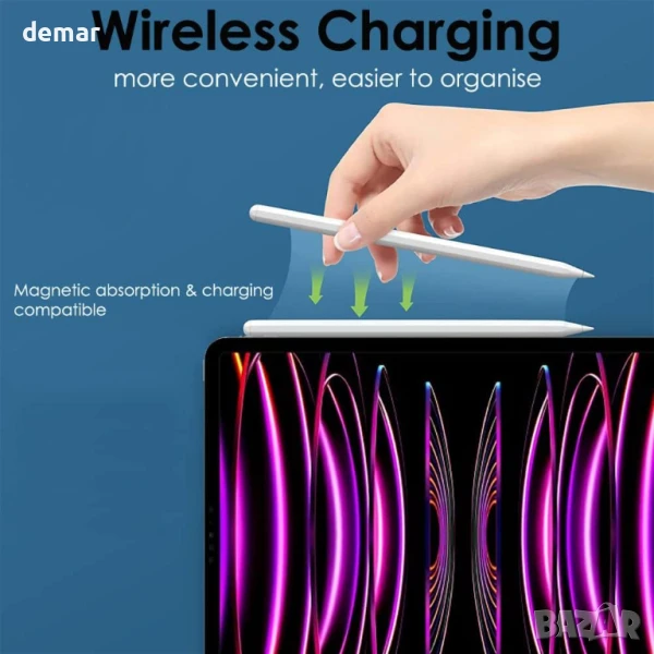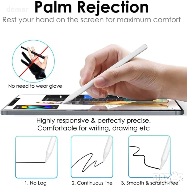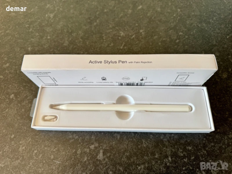 Съвместим с модели iPad, които поддържат магнитно зареждане (с изключение на 2024 iPad Pro 11"/13"), този стилус се прикрепя магнитно за зареждане и се сдвоява чрез Bluetooth, за да показва нивото на батерията и да активира функции за бърз достъп, като връщане в началния екран и многозадачност. Той е с функция за отхвърляне на дланта за естествено усещане при писане без забавяне и чувствителност към накланяне за различна дебелина на линията, идеална за скициране. 1,5-милиметровият връх предлага гладко, подобно на хартия, изживяване без драскотини. Активира се чрез докосване с продължително натискане и се изключва автоматично след 5 минути неактивност, а също така поддържа управление с жестове, като например заснемане на екранна снимка. Включва стилус и два резервни накрайника.