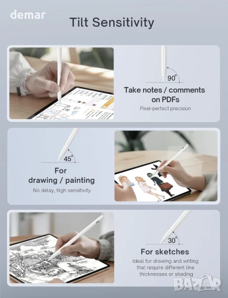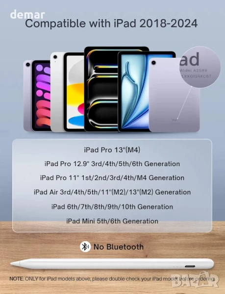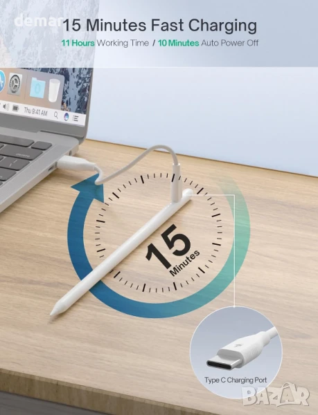 Този стилус за iPad поддържа магнитно безжично зареждане на избрани по-стари модели iPad (не е съвместим с моделите M4 и M2 от 2024 г.) и предлага бързо зареждане чрез USB-C. Той разполага с отхвърляне на дланта за удобно писане, чувствителност към накланяне за прецизно засенчване и прост превключвател с един бутон, без нужда от Bluetooth. Съвместим с iPad от 2018 до 2024 г., той включва множество опции за накрайници за писане, скициране или детайлна работа и се предлага с допълнителни накрайници и кабел за зареждане. Магнитното зареждане няма да работи, ако батерията на стилуса е напълно изтощена.