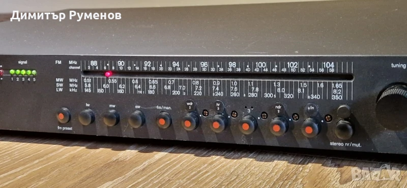 Качествен тунер в много добро състояние - отлична чувствителност в стерео режим. Добър външен вид, с изключение на капака отгоре, протрито (снимки).Солидно изграден, тежък, метален корпус, година 1978-1979та Германия. Размери 500 x 65 x 330 мм. Изход петица.