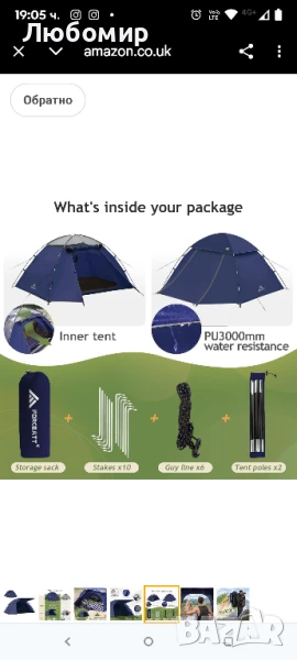 Комплект с аксесоари: Пакетът се предлага с: 10 колчета за земя, 6 въжета за вятър с дължина 1,5 м, палатка, дъждобран, чувал за съхранение, общо тегло 2,4 кг (5,3 фунта), палатката е идеална за начинаещи в дейности на открито