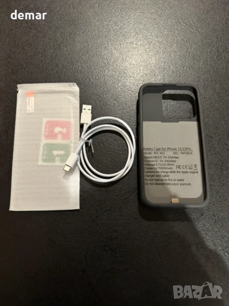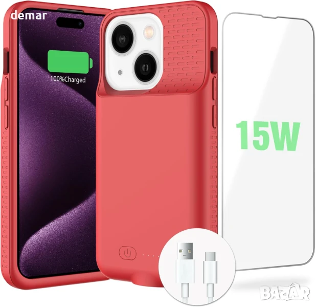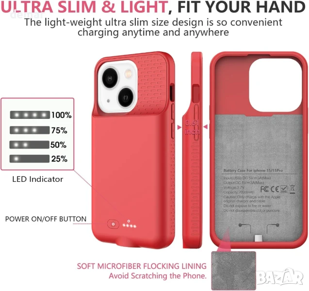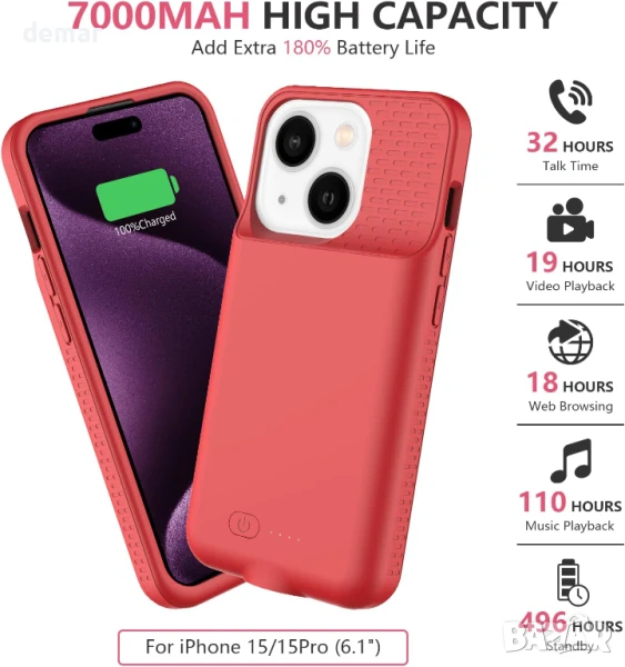 Тънък и лек, този калъф с батерия 7000mAh за iPhone 15/15 Pro осигурява до 120% допълнителна мощност, предлагайки удължено време за разговори, музика и видео, което го прави идеален за пътуване и работа. Лесен е за инсталиране с TPU прилягане и разполага с LED индикатор и лесно управление с бутони. Проектиран с бързо 15W зареждане и 360° защита, той предпазва телефона ви от ежедневно износване, като същевременно го поддържа зареден. Забележка: не е съвместим с iPhone 15 Pro Max/15 Plus, безжично зареждане или CarPlay. Предлага се с протектор за екран, кабел за зареждане и ръководство за потребителя.