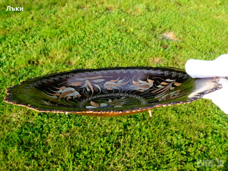 флорални мотиви и орнаменти.По ръба има красив кован релеф.Стои стабилно на три