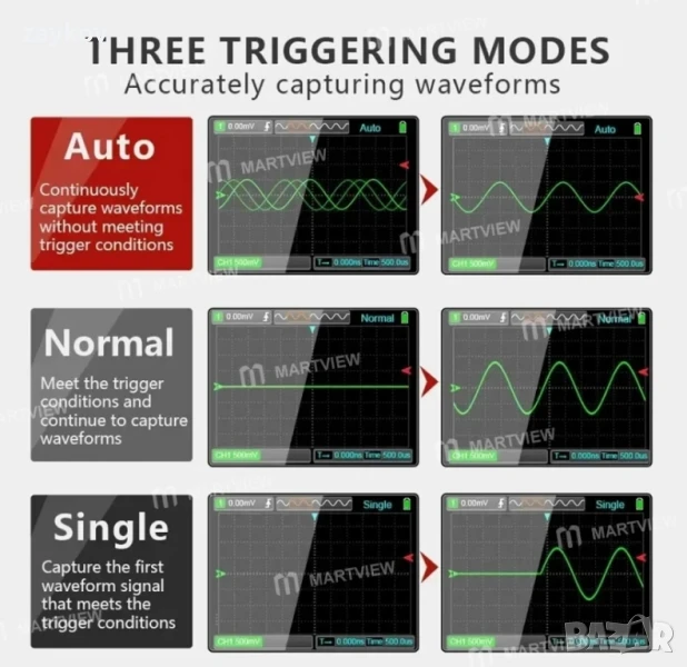 Автоматично измерване, DSO реализира автоматично измерване с един бутон, автоматично показване на формата на измерваната вълна и автоматична корекция на нулата.
