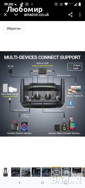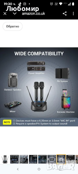 IR сдвояване и Bluetooth вход: Безжичната микрофонна система има функция за автоматично IR съвпадение, която търси най-добрата честота. Просто я свържете към устройство с микрофонен вход (високоговорител, миксер, PA система, караоке машина и др.), като използвате включения 6,35 мм аудио кабел, и можете да започнете да я използвате. Приемникът има също Bluetooth и 3,5 мм вход за слушалки, така че можете да възпроизвеждате фонова музика от телефона или iPad-а си за караоке забавление.