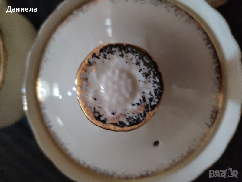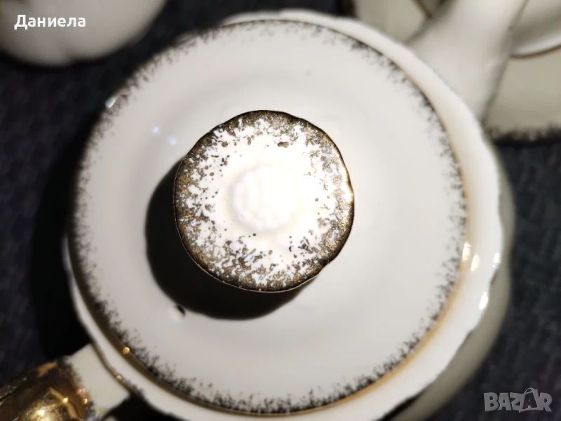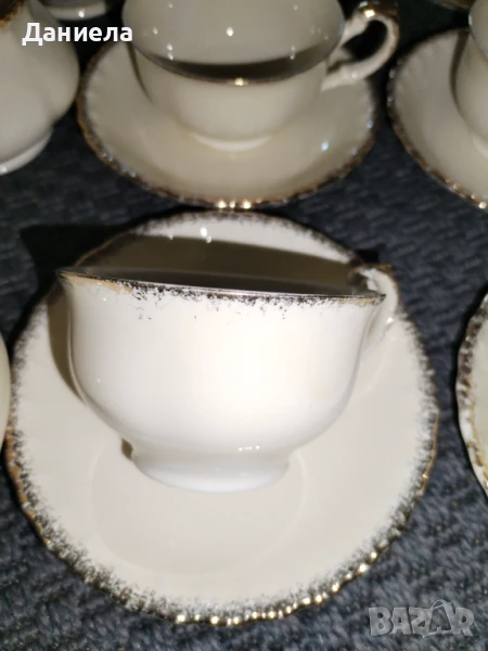 Стилен и красив порцеланов сервиз за чай или кафе с релеф и златна украса в млечно - бял цвят.