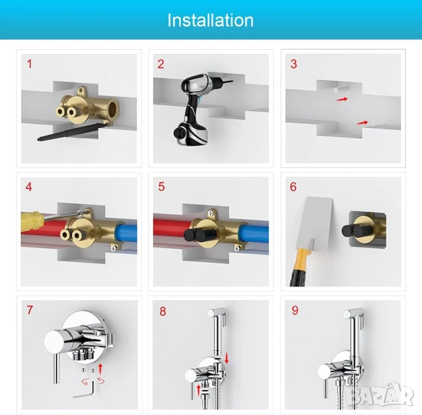 Монтаж: Скрит монтаж в стената, с включена вградежна част и държач