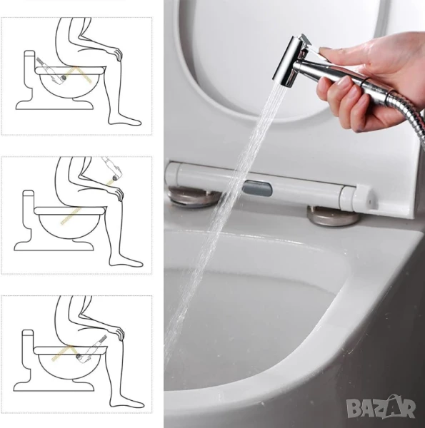 Душ-бръсначка: С удобен ръчен накрайник и гъвкав метален или неръждаем маркуч (1.2–1.5 м)