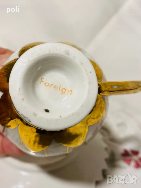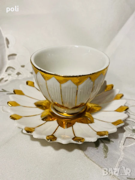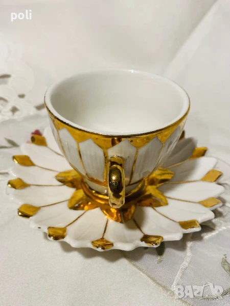 Антикварна чашка за късо кафе . Диаметър 6,5 см , височина 5 см , чинийка 10 см . На места позлатата на чинийката е избеляла . Цена 25 лв .