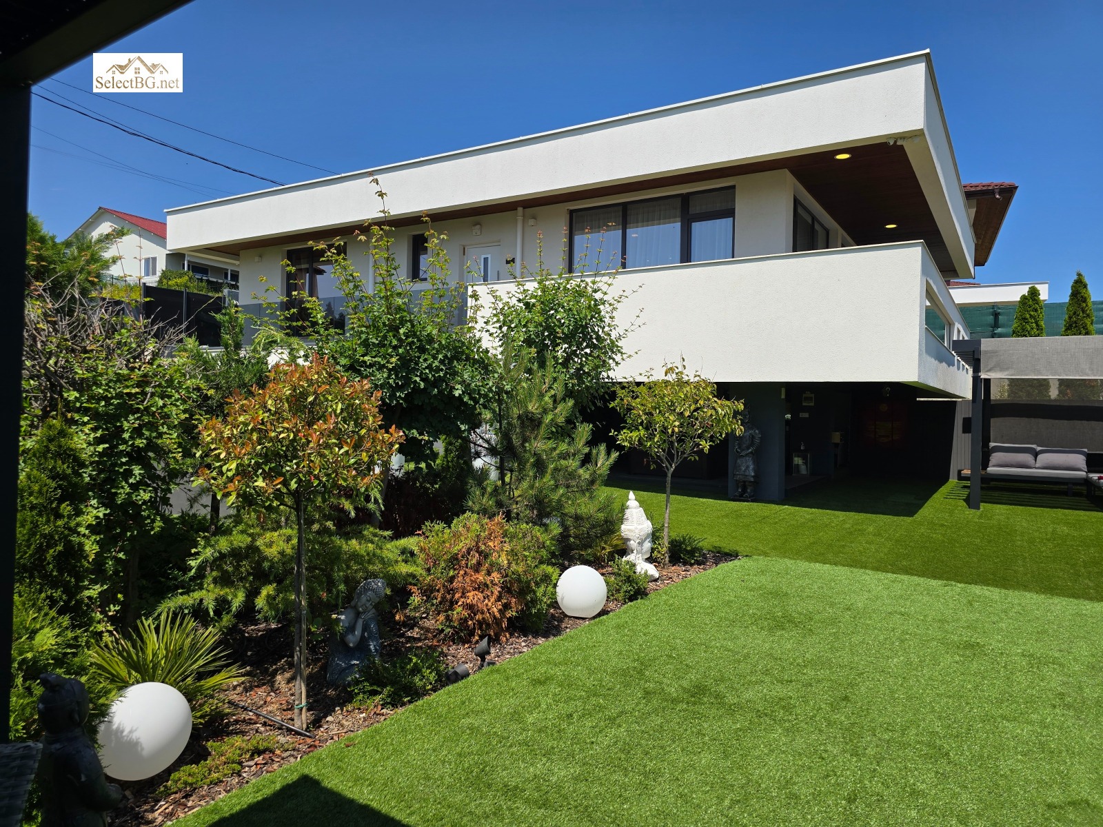 Дворът ( градината ) е около 800 м2 , с много зеленина и богат набор от екзотични растения и храсти и създава усещане за уединение , спокойствие и хармония. Обособени са различни кътове от модерна пергола- барбекю с напълно оборудвана лятна кухня, през мъжки бар кът за забавления, външно СПА с джакузи , басейн с релакс зона и др, като всяко нещо е точно на мястото си.